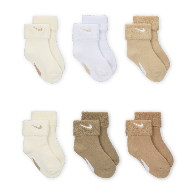 Nike 嬰兒翻邊毛圈布襪口運動短襪(6 對)採用柔軟棉混紡物料製成,配搭精巧羅紋結構,讓孩子腳趾保持舒適。 紋理翻邊襪口飾有刺繡標誌,帶來舒適感受。