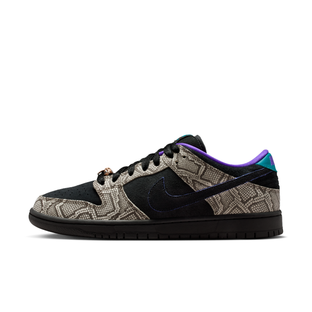 Dashawn Jordan 每次踏上滑板都充滿活力,而他總是穿著 Dunks。這次他為最愛的滑板鞋注入了家鄉元素,Nike SB Dunk Low x Dashawn Jordan 男子滑板鞋採用西南風情紋理和色彩。仿蛇紋鞋面靈感來自鳳凰城特有的菱斑響尾蛇,鞋舌內側和鞋跟以綠松石色和深紫色點綴。銅色尖牙鞋帶扣為造型畫龍點睛。