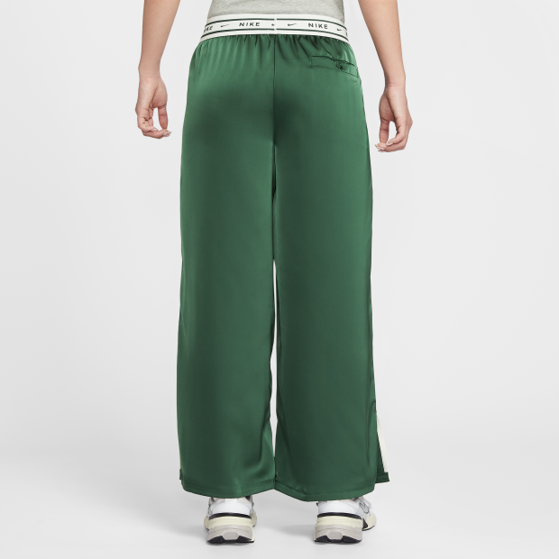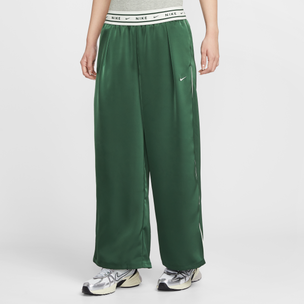 這款 Nike Sportswear 女子寬鬆中腰緞面長褲採用緞面物料和闊腿設計,質感奢華。滾邊細節和品牌彈性腰頭為這款精緻造型增添運動風格。