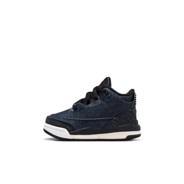 Jordan 與 Levi's® 再度聯手,煥新演繹 Air Jordan 3 x Levi's® 嬰童運動鞋。鞋面採用優質靛藍牛仔布,飾有同色調黑色象紋印花,打造時尚的深色水洗外觀。Levi's® 的經典圖案與右腳鞋眼的紅色標籤相得益彰,外底和鞋墊亦採用同款細節。