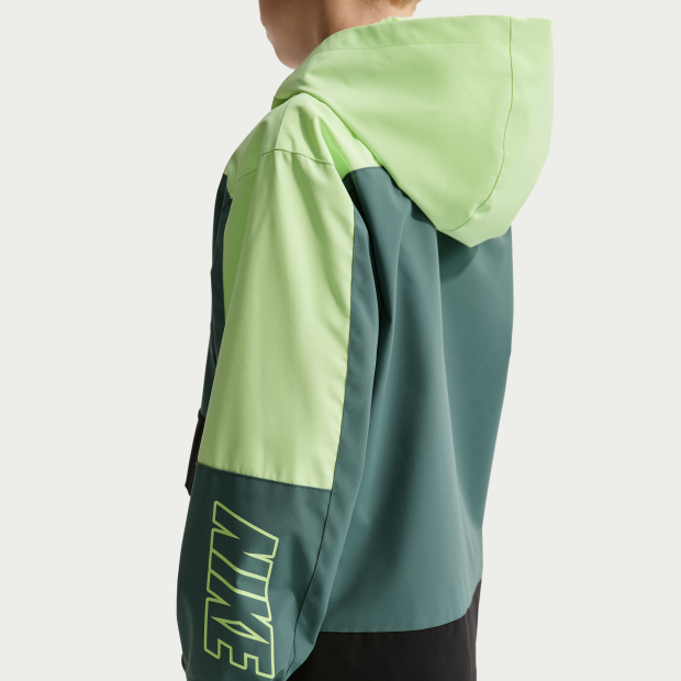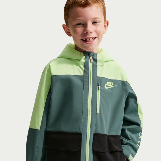 Nike 幼童中長外套飾有標誌圖案,梭織物料結合毛絨裁片裡布,輕盈保暖,讓孩子在春秋季節保持舒適。全拉鍊式開襟設計,搭配內置擋風片,結合連帽設計,有助提升包覆效果;魔術貼粘扣口袋可穩妥收納小型物品。