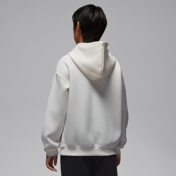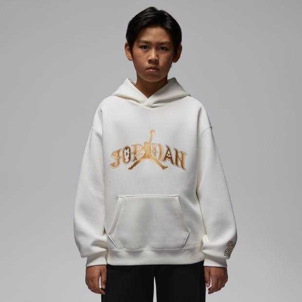 Jordan 新年系列大童套穿式連帽衫採用棉混紡針織物料製成,並加入金屬色圖案,與你舒適慶新禧,落肩設計令穿著更加舒適。配搭任何 Jordan 新年系列下裝,締造完整造型,在節慶及其他場合穿著。