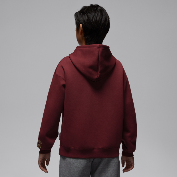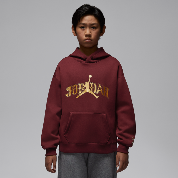 Jordan 新年系列大童套穿式連帽衫採用棉混紡針織物料製成,並加入金屬色圖案,與你舒適慶新禧,落肩設計令穿著更加舒適。配搭任何 Jordan 新年系列下裝,締造完整造型,在節慶及其他場合穿著。