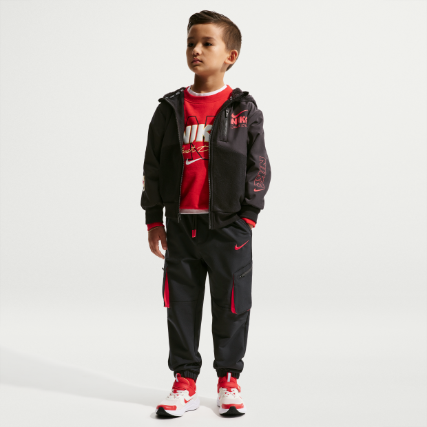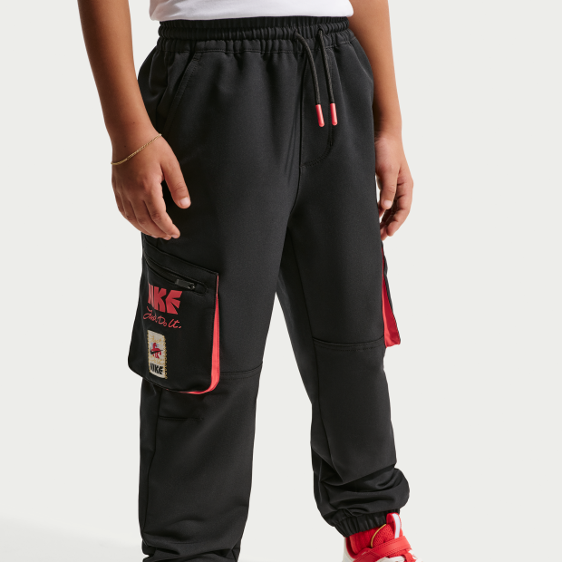 Nike Sportswear 馬年限定脫繮系列新年款幼童梭織工裝長褲採用梭織聚酯混紡物料製成,更富彈性,讓孩子在玩樂時活動自如。薄絨裡布,溫暖舒適。褲腿工裝口袋配有拉鍊,可妥善收納鎖匙等小型必需品。彈性腰頭配有抽繩,帶來舒適貼合感;窄腳設計配搭彈性褲腳,穿著更穩固;斜角口袋提供空間收納小型物品。配搭任何 Nike 新年款上衣,呈現協調造型,襯托孩子腳上的運動鞋。