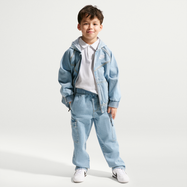 Nike Sportswear 幼童牛仔工裝長褲以運動風格重新詮釋經典衣櫃必備款式。採用棉質牛仔布製成,結合窄腳剪裁,打造利落外觀;彈性腰頭內設抽繩,帶來舒適體驗,寬敞工裝口袋有助穩固存放孩子冒險旅程所需的小型物品。