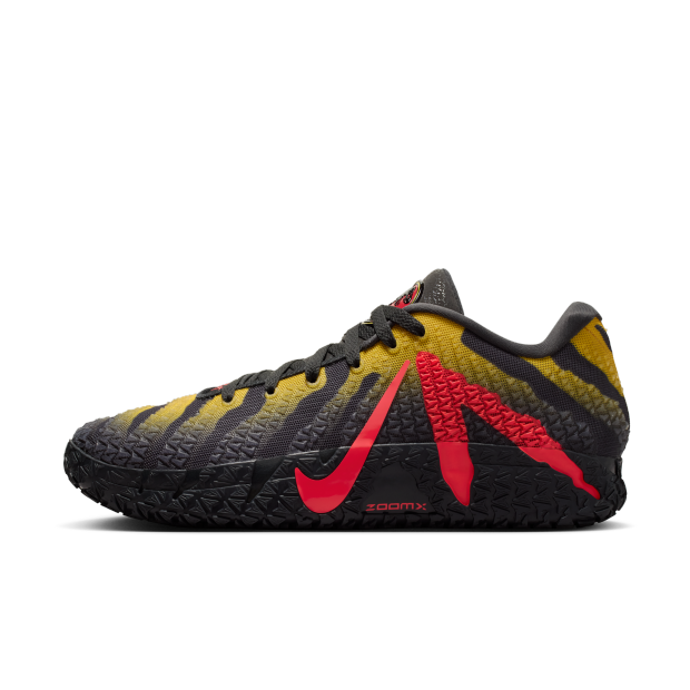 Ja 跟我們的設計師溝通時,要求十分明確。 他說:「我叫他們不要怕, 放膽去突破。」 成果如何? Ja Swoosh 設計:採用垂直的 Swoosh 標誌以及旁邊塗鴉風格的「A」字,再加上粗獷的刮痕細節,打造出為聚光燈而生的破格鞋款。