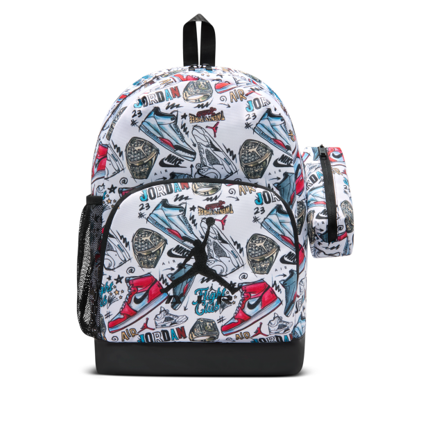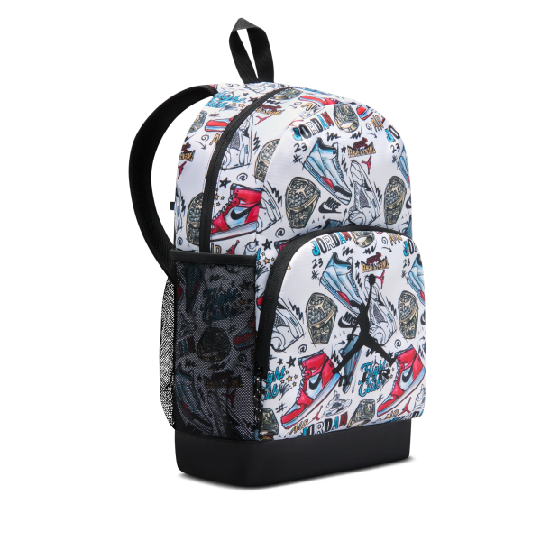 Jordan Air Raid 兒童背包採用空間寬敞的主間隔,內設有加墊手提電腦護套,正面則設有口袋,可妥善存放小物,方便存取,而水瓶側袋則可收納飲料。可調節式加墊肩帶無比舒適,並搭配同款小掛包,讓隨身小物件井然有序地收納。