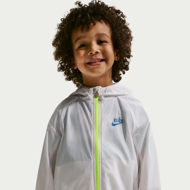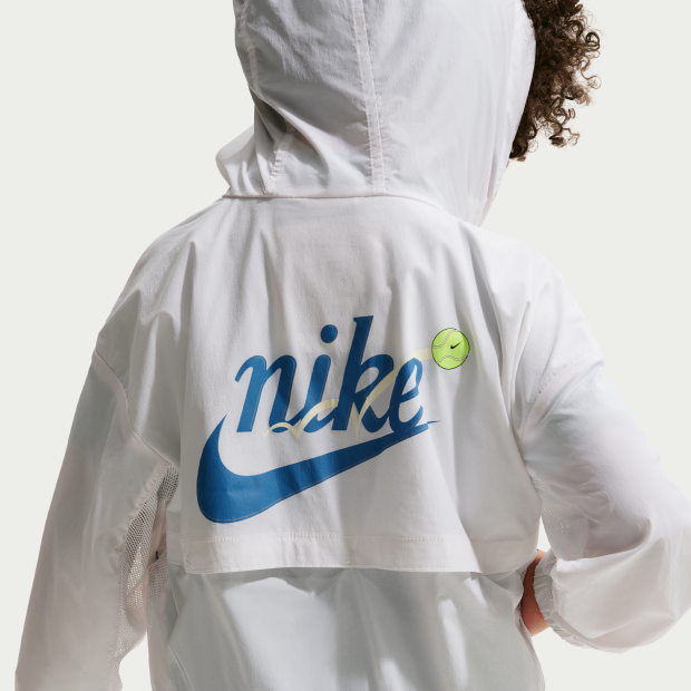 這款連帽輕盈的 Nike 嬰童網球外套採用梭織物料製成,富有彈性,讓小小網球迷活動自如。腋下網眼布裁片與背部開口設計提升透氣度,落肩設計帶來輕鬆穿著感,彈性袖口和下襬穩固貼合。